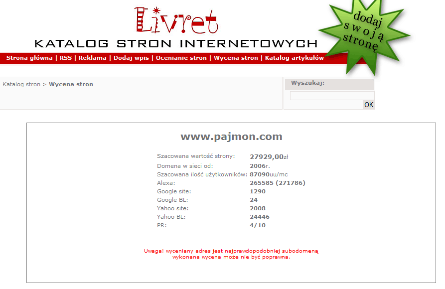 No i po tym przydługim jak zwykle wstępie przechodzę do sedna dzisiejszego wpisu: automatycznej wyceny stron. Wróciłem bowiem z urlopu i pierwsze co muszę nadrobić to przejrzeć posty na forum PiO jakie pojawiły się podczas mojej nieobecności; Google działa, to widzę nawet bez PiO, ale kto wie, co innego mogło mnie ominąć. Natrafiłem na wątek kolegi Radar22, który proponuje Automatyczną wycenę stron internetowych. Zanim przeczytałem to, co inni koledzy pisali dalej w tamtym wątku, postanowiłem wycenić swój blog o pozycjonowaniu. Przyznam, że choć Pajmon.com jest dla mnie niezwykle cenny, to takiej sumy się nie spodziewałem**.